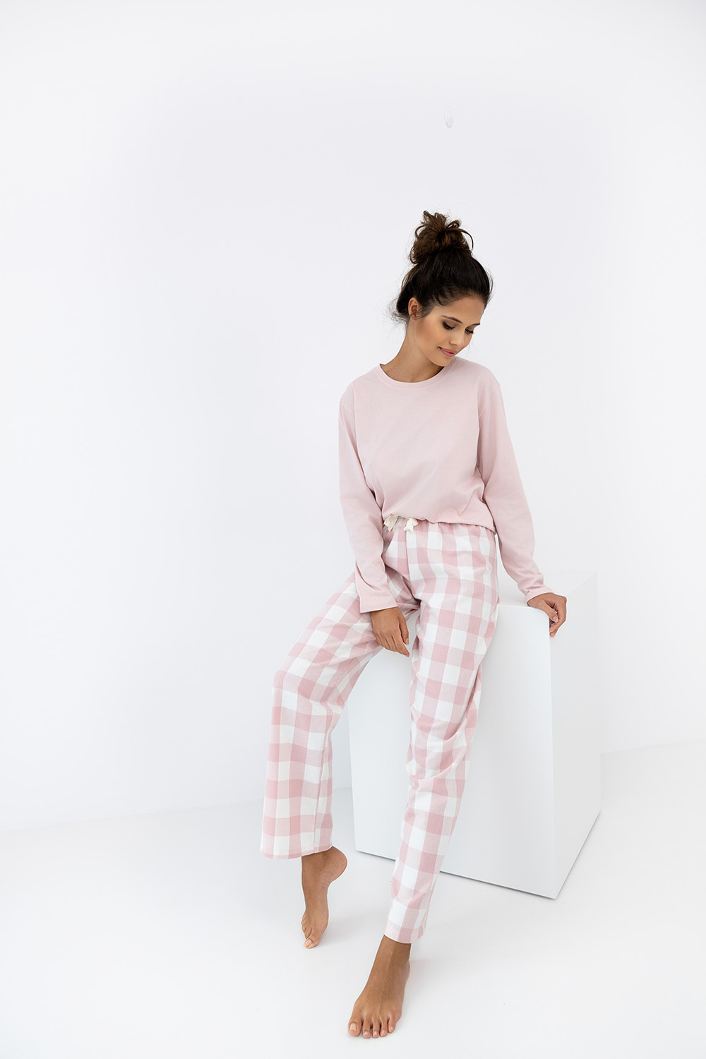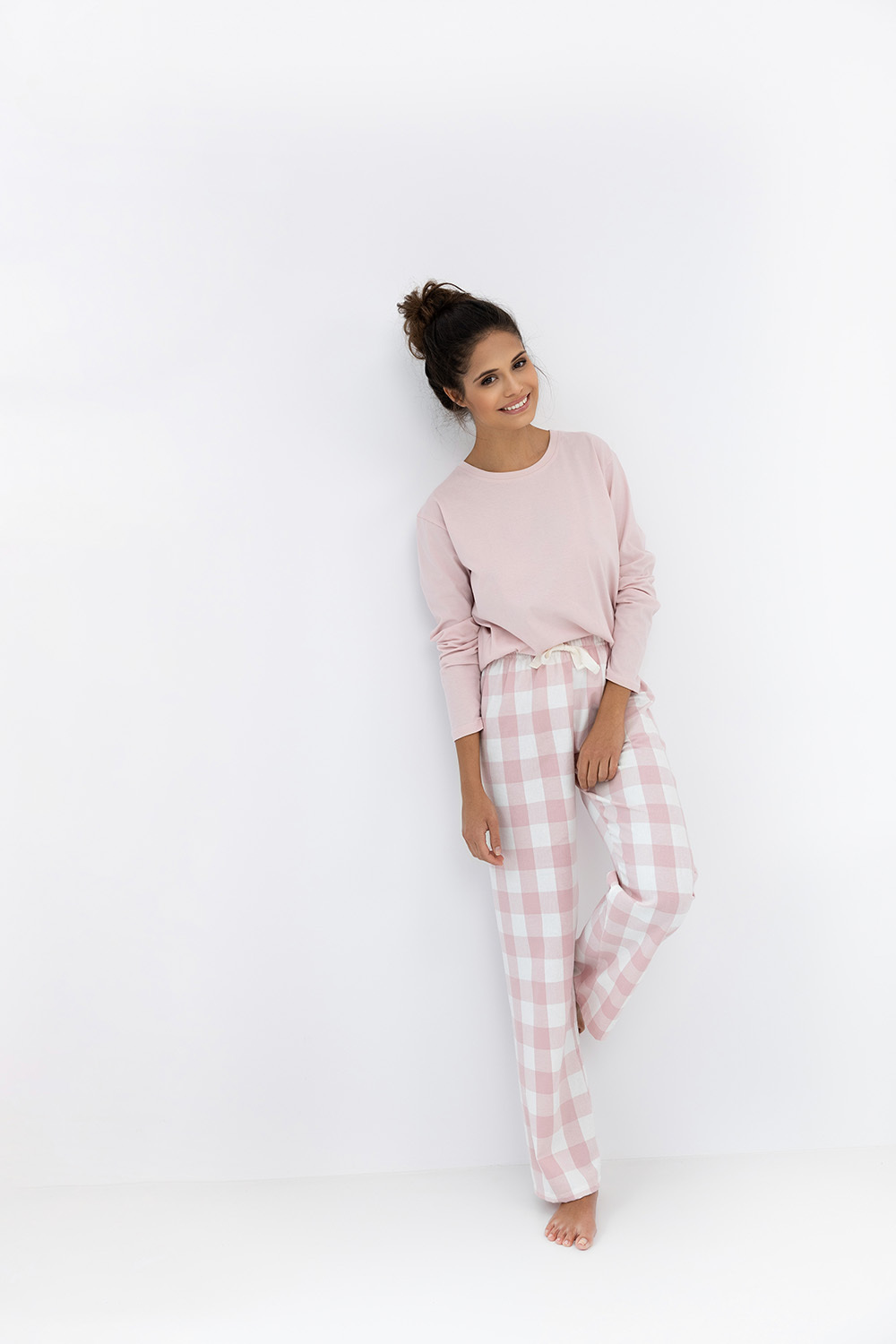 Женская пижама Saylor с прямыми брюками и однотонным лонгсливом. Брюки в крупную клетку с контрастным бантиком на поясе. Идеальный вариант не только для сна, но и для домашнего отдыха.