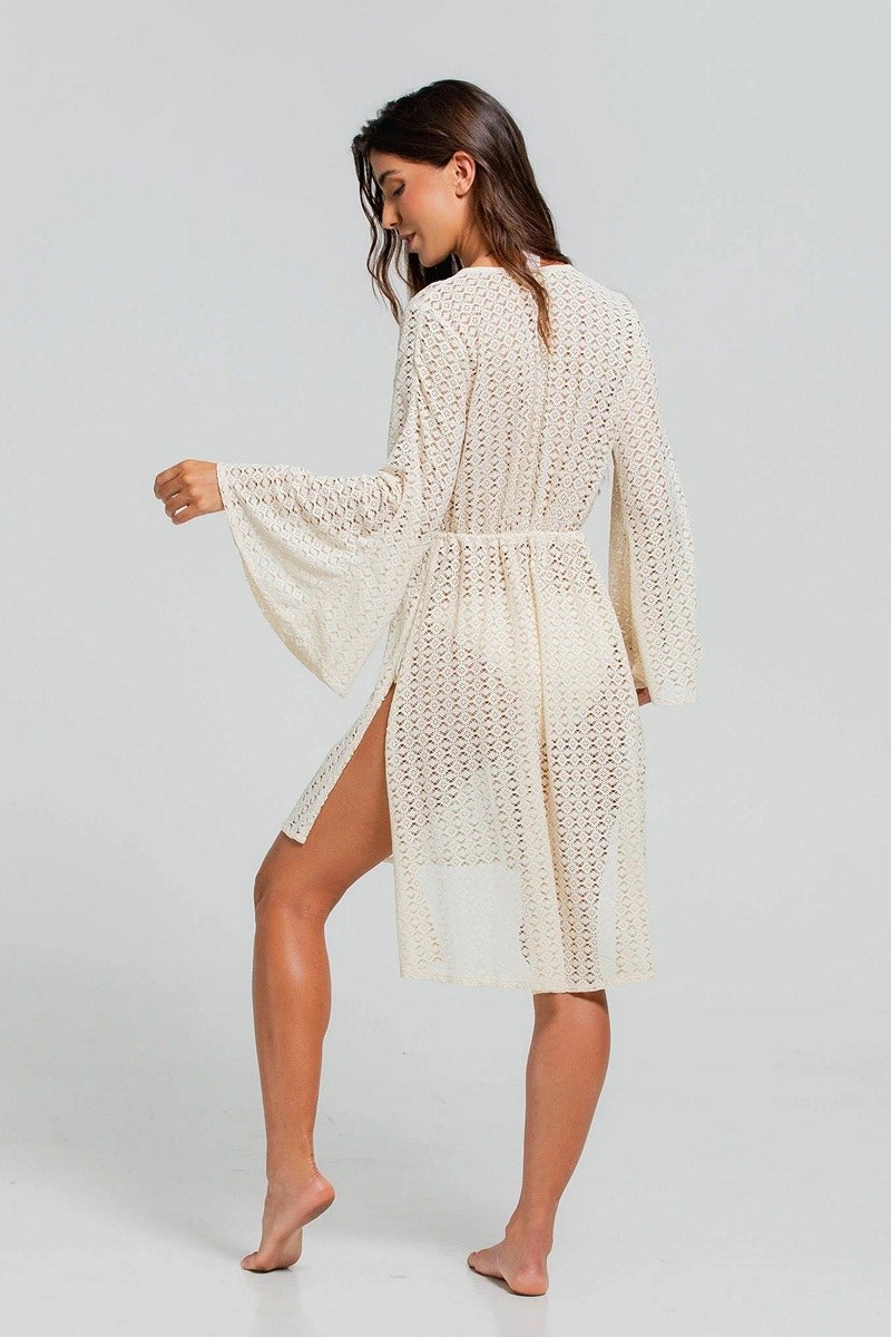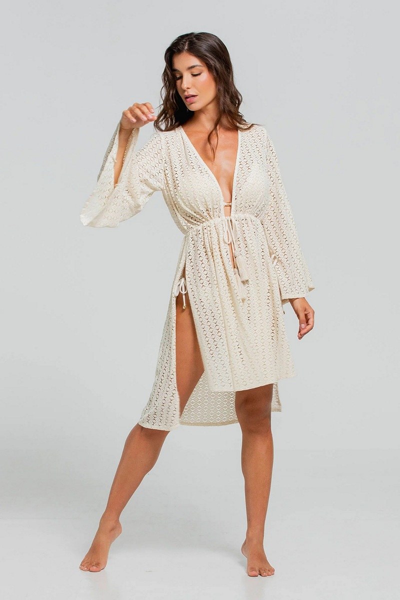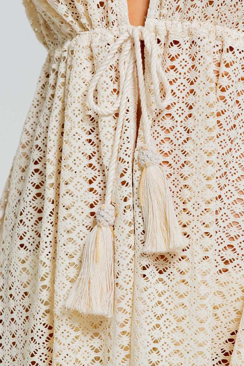 Пляжное кимоно от колумбийского бренда Cosita Linda. Легкое и изящное кимоно изготовлено вручную с помощью крючка и украшено кистями, которые грациозно покачиваются при движении. Легкое и элегантное, оно прекрасно сочетается с купальником, создавая изысканный образ для отпуска.